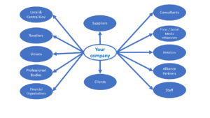 A stakeholder is a group / company / organisation / person that is directly or indirectly affected by your business. That sounds very vague doesn’t it? So let’s take a look at a stakeholder map: